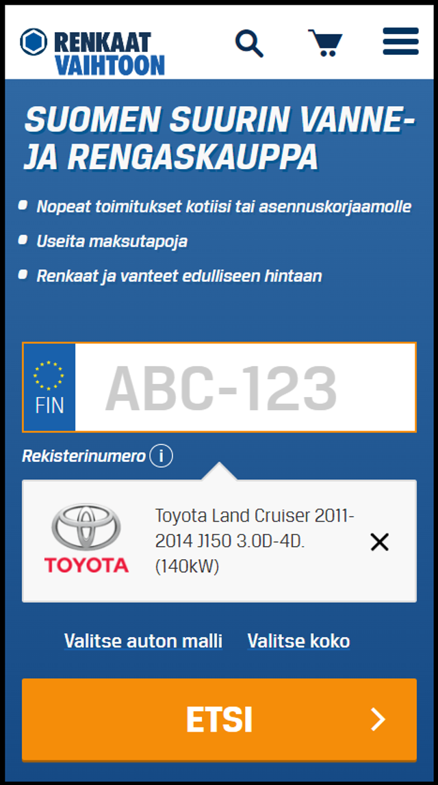 Anna rekisterinumerosi. Jos sinulla on yksilöllinen kilpi, voit silti hakea tavallisimpia yhdistelmiä autoosi. Paina sen jälkeen Hae, ja pääset näkemään juuri sinun autoosi sopivat tarvikkeet!
