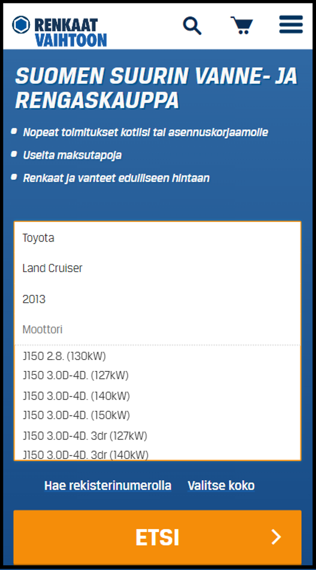 Tekemällä haun rekisterinumeron perusteella kotisivullamme näet autoosi sopivat tuotteet. Jos autosi rekisterinumero jostain syystä puuttuu tietojärjestelmästämme, voit helposti hakea autoasi kirjoittamalla ajoneuvotiedot manuaalisesti.