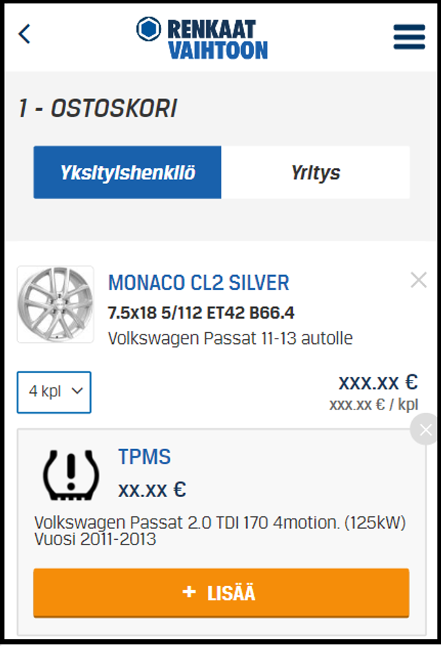 Kun olet valinnut kokonaiset renkaat tai vanteet, jatka eteenpäin ostoskoriisi. Siellä sinulle tarjotaan mahdollisuus täydentää tilauksesi TPSM-järjestelmällä. Hinta ja tyyppi riippuvat autosi mallista, ja siksi suosittelemme suorittamaan ostoksesi rekisterinumerohaun avulla.